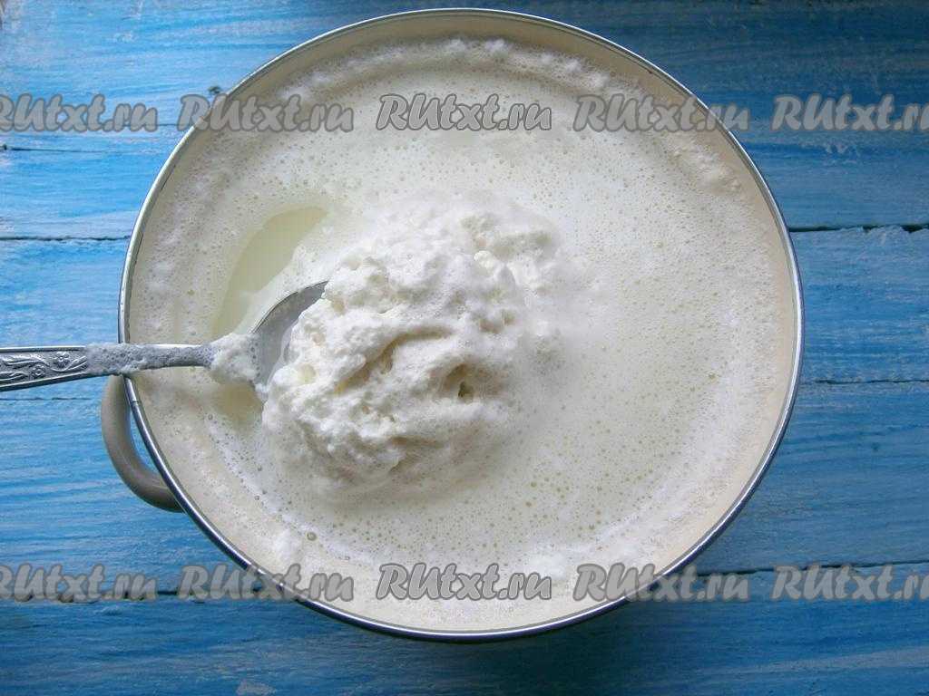 Как только молоко начнёт закипать, сразу же вылить в него лимонный сок, огонь убавить. Молоко нужно мешать ложкой до тех пор, пока не отделится сыворотка от творога (как на фото). Кастрюлю убрать с огня.