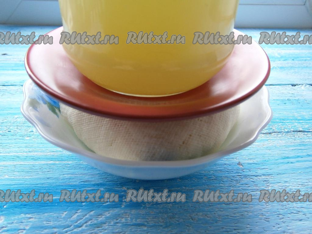 Далее марлю с творогом завязать и подвесить в удобном месте на 1 час, чтобы вся сыворотка стекла. Творог прямо в марле поместить в глубокую посуду (или пластиковый контейнер), сверху поставить тарелку, поверх которой разместить гнёт (в качестве гнёта я использовала банку с отцеженной сывороткой).