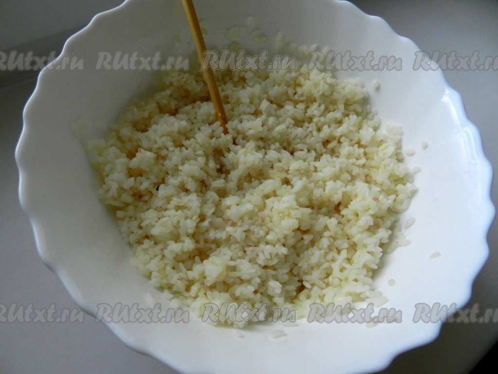 Готовый рис заправить соусом, перемешать деревянной палочкой. Накрыть салфеткой и оставить на 20 минут.