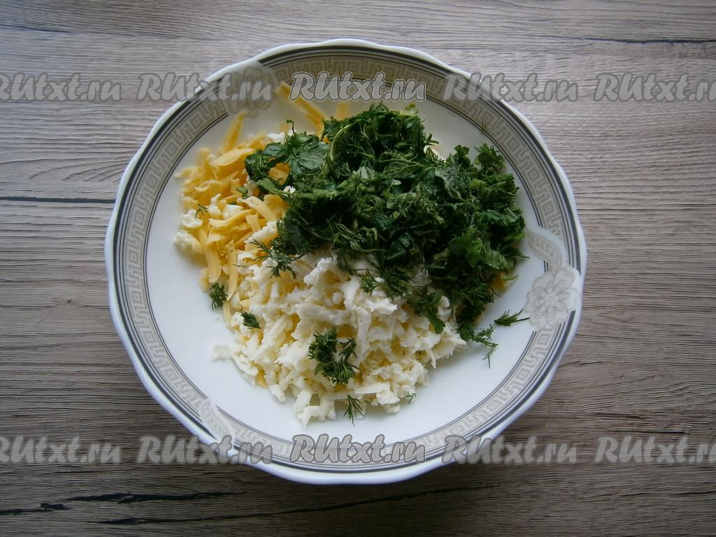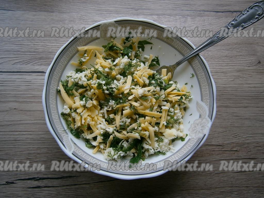 Сыр с зеленью хорошо перемешать. Соль я в начинку не добавляю, так как её достаточно в сыре.