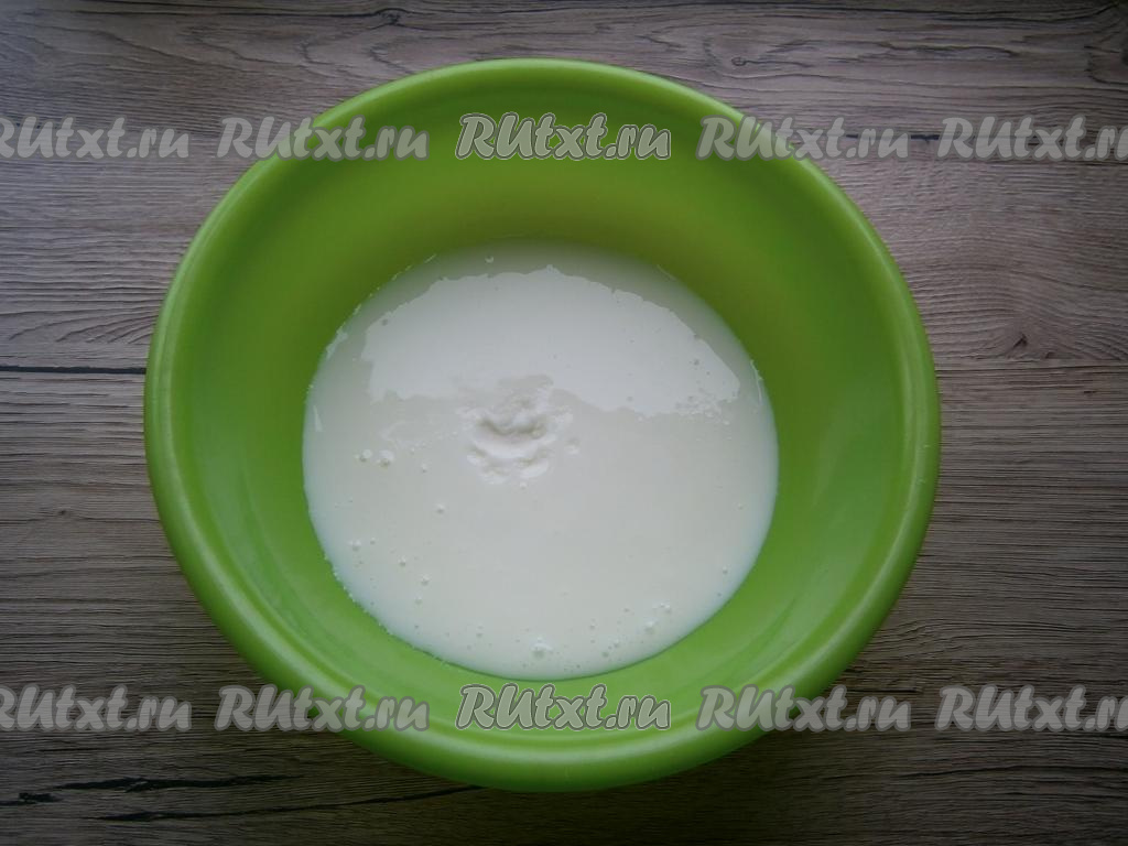 Кефир для замешивания теста для лепёшек можно взять любой жирности. Желательно, чтобы кефир был комнатной температуры, поэтому я либо заранее достаю его из холодильника, либо подогреваю в течение 20 секунд в микроволновке. В достаточно глубокую тарелку влить кефир комнатной температуры, всыпать соду, перемешать и оставить на 3-4 минут. Сода вступит в реакцию с кефиром. Кефир покроется пузырьками и увеличится в объёме.