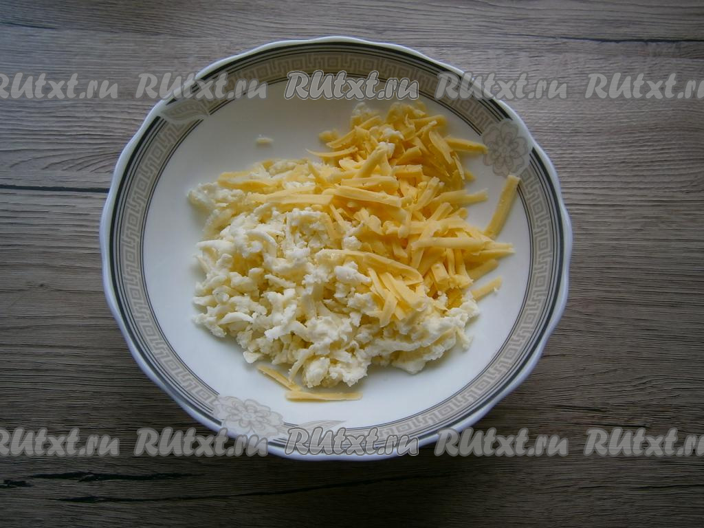 Зелень (у меня - укроп и петрушка) вымыть, обсушить. Сыр можно взять любой твёрдый или полутвёрдый. Я взяла примерно в равных пропорциях адыгейский и российский сыр. Сыр нужно натереть на крупной тёрке в глубокую тарелку.