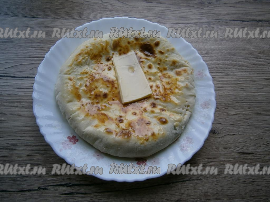 Готовую лепёшку переложить со сковороды на тарелку и сразу, пока она горячая, щедро смазать с двух сторон сливочным маслом.