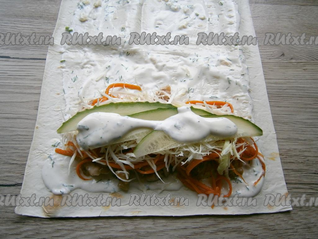 Капусту нарезать на тонкие полоски. Огурец промыть водой, отрезать кончики с двух сторон, затем нарезать на тонкие полоски. Поверх морковки выложить половину нарезанной капусты и половину нарезанного огурца. Сверху начинку шаурмы немного смазать соусом.