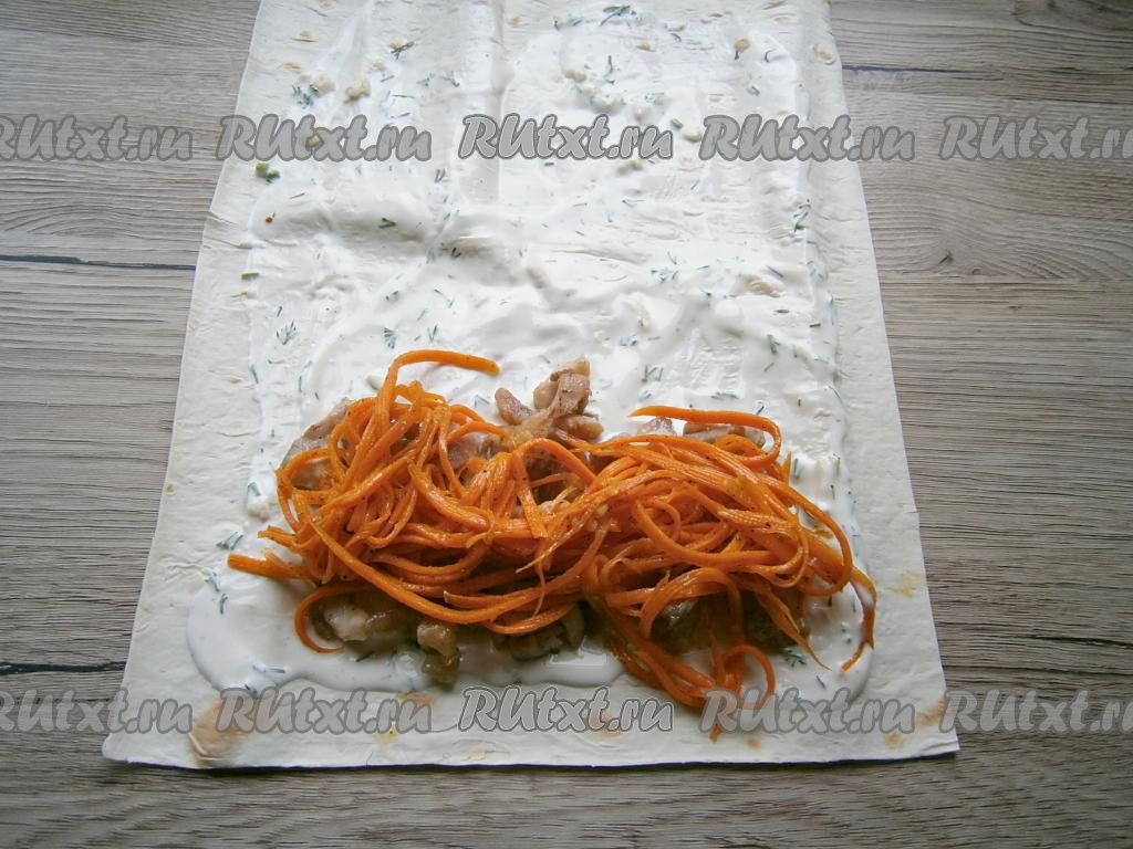 Аккуратно подвернуть боковые края лаваша на начинку, а затем, начиная со стороны с начинкой, свернуть лаваш в рулет, у нас получится шаурма с курицей, корейской морковью и капустой. Аналогично сформировать вторую шаурму из второго лаваша и оставшихся продуктов для начинки.
