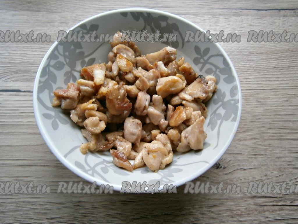 Куриное мясо (у меня - куриное филе) вымыть, обсушить, нарезать на небольшие кусочки, посолить, поперчить перемешать, выложить в сковороду, разогретую с растительным маслом сковороду. Обжарить его со всех сторон на среднем огне до готовности (в течение минут 7-10), иногда перемешивая. Дать мясу курицы остыть.