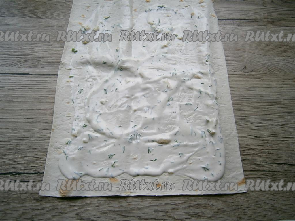 Для приготовления соуса смешать сметану и майонез, добавить пропущенный через пресс чеснок и мелко нарезанный укроп, посолить, поперчить, перемешать. Я делала 2 шаурмы, поэтому все ингредиенты при формировании шаурмы делила на 2 равные части. На столе разложить первый лист лаваша. Поверх лаваша нанести чуть меньше половины получившегося сметанно-майонезного соуса, отступая от краёв лаваша по 2-3 сантиметра, как на фото.