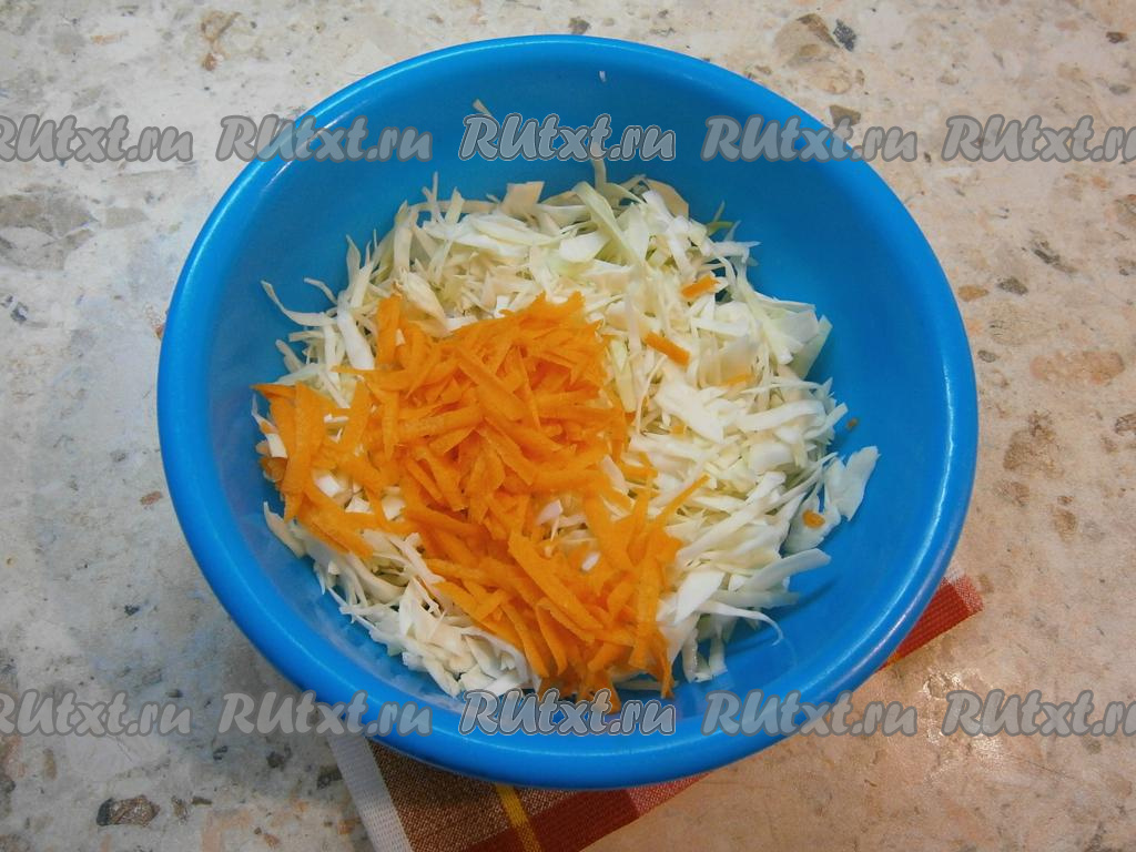 Яйцо отварить в течение 10 минут с момента закипания воды, после этого остудить. Капусту промыть водой. Морковь и чеснок очистить. Нарезать капусту на тонкие полоски, выложить в глубокую миску, чуть посолить и помять руками. Мять капусту нужно для того, чтобы она стала более сочной и нежной. Если вы готовите этот салат с молодой капустой, её можно не мять руками, она и так достаточно сочная. В миску с капустой добавить сырую морковь, натёртую на крупной тёрке.