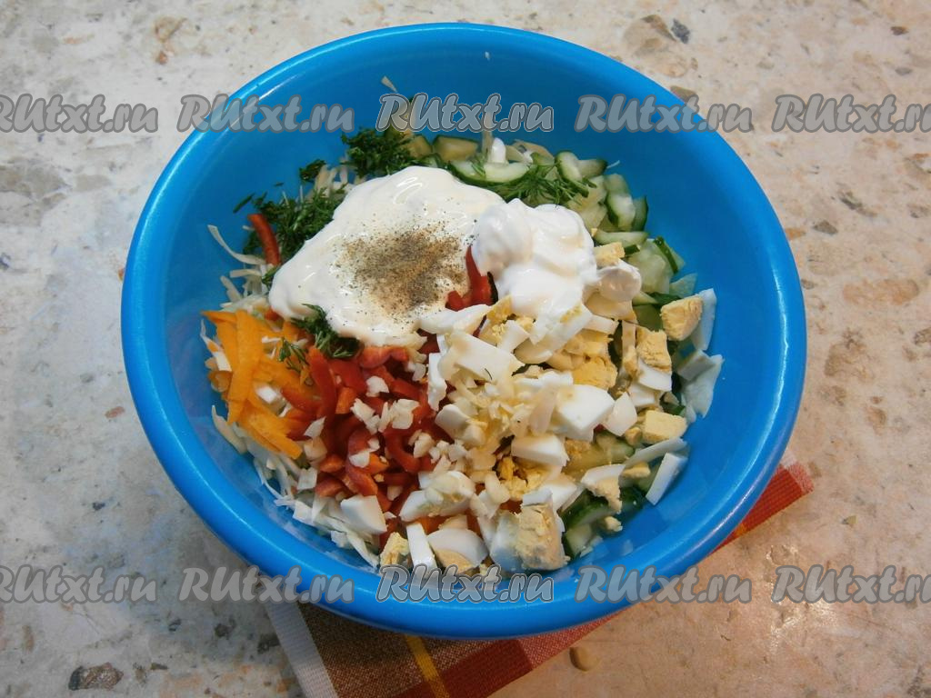 Укроп промыть водой. Мелко нарезанный укроп и очищенное яйцо, нарезанное на небольшие кусочки, добавить в салат из капусты, моркови, огурца и болгарского перца.