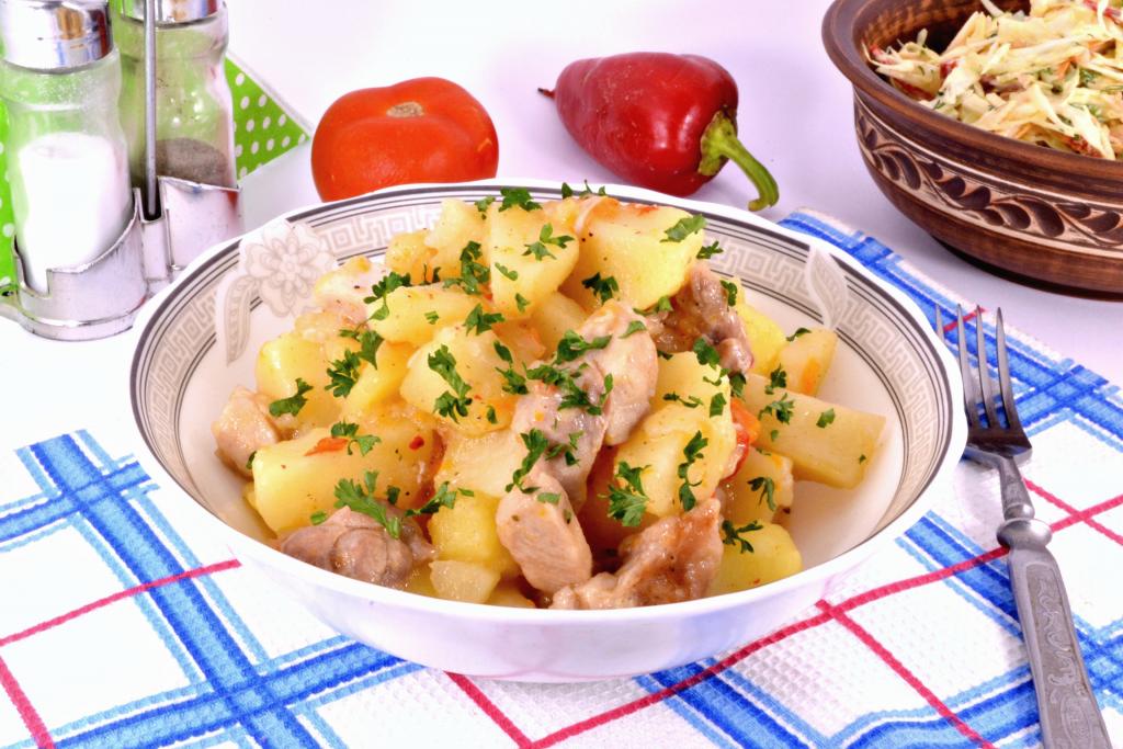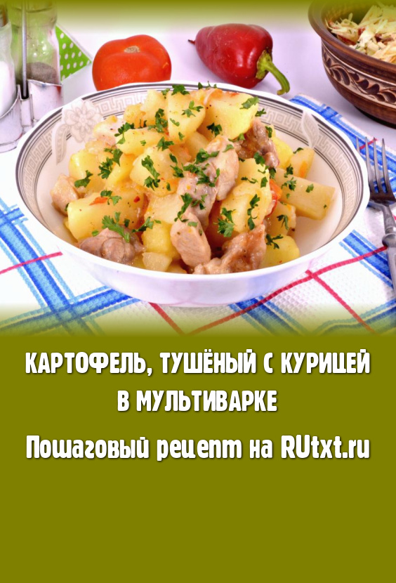 Выставить программу "Тушение" на 50 минут. Готовый очень вкусный картофель, тушёный с курицей в мультиварке, аккуратно перемешать, разложить по тарелкам и подать в горячем виде к столу.