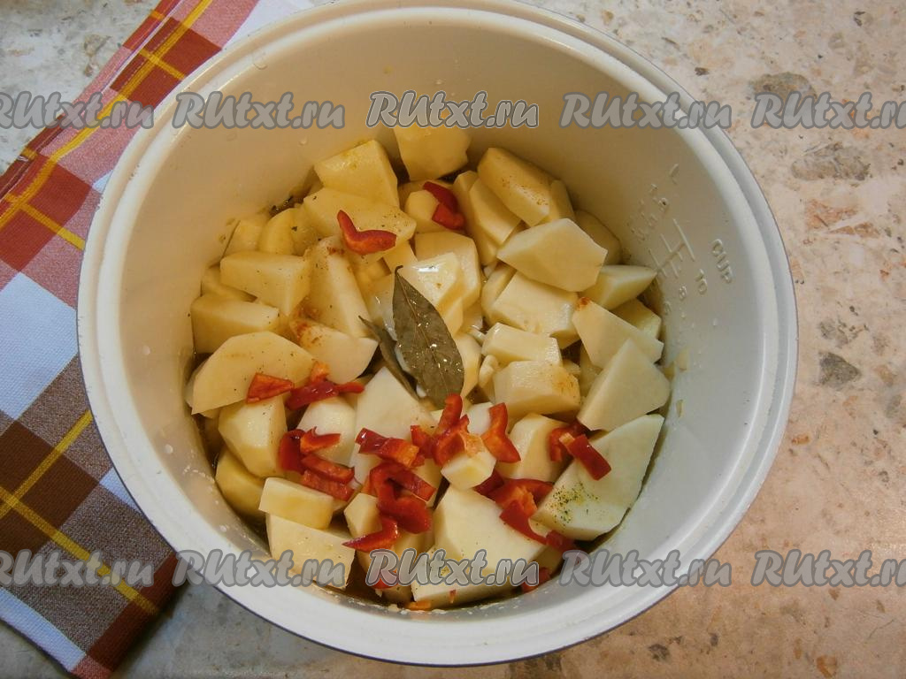 Картофель очистить и нарезать довольно крупно. Болгарский перец, очистив от семян, нарезать на полоски. Добавить картошку и болгарский перец к курице в чашу мультиварки, всыпать соль, специи (в качестве специй я всыпала паприку и приправу для картофеля), нарезанный чеснок и лавровые листья.