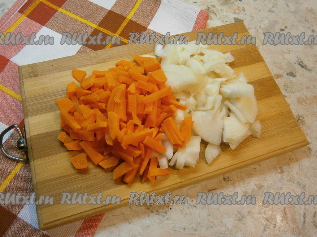 Лук и морковь очистить, нарезать на небольшие, но и не на совсем маленькие кусочки.