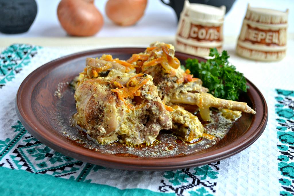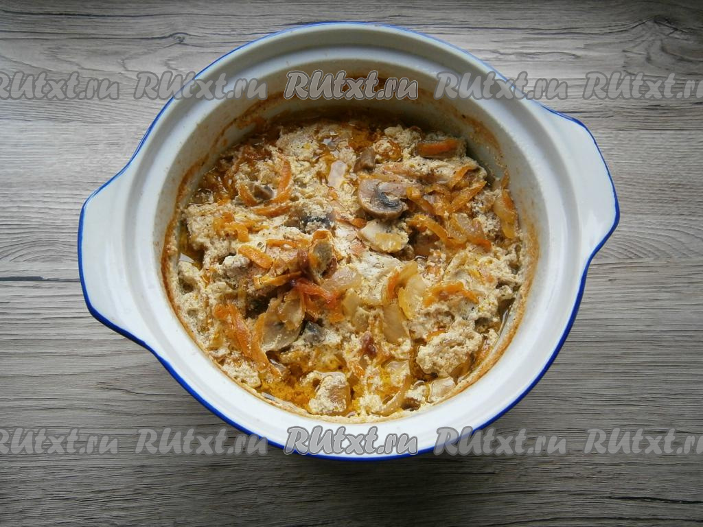 Накрыть форму для запекания крышкой (или фольгой) и поместить в разогретую до 170 градусов духовку, запекать кролика с грибами в сметане 1 час 20 минут.