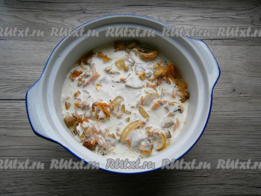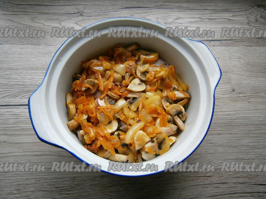 Сверху ровным слоем выложить остывшие жареные грибы, морковку и лук.