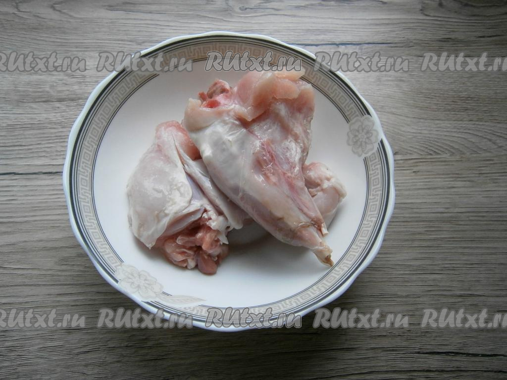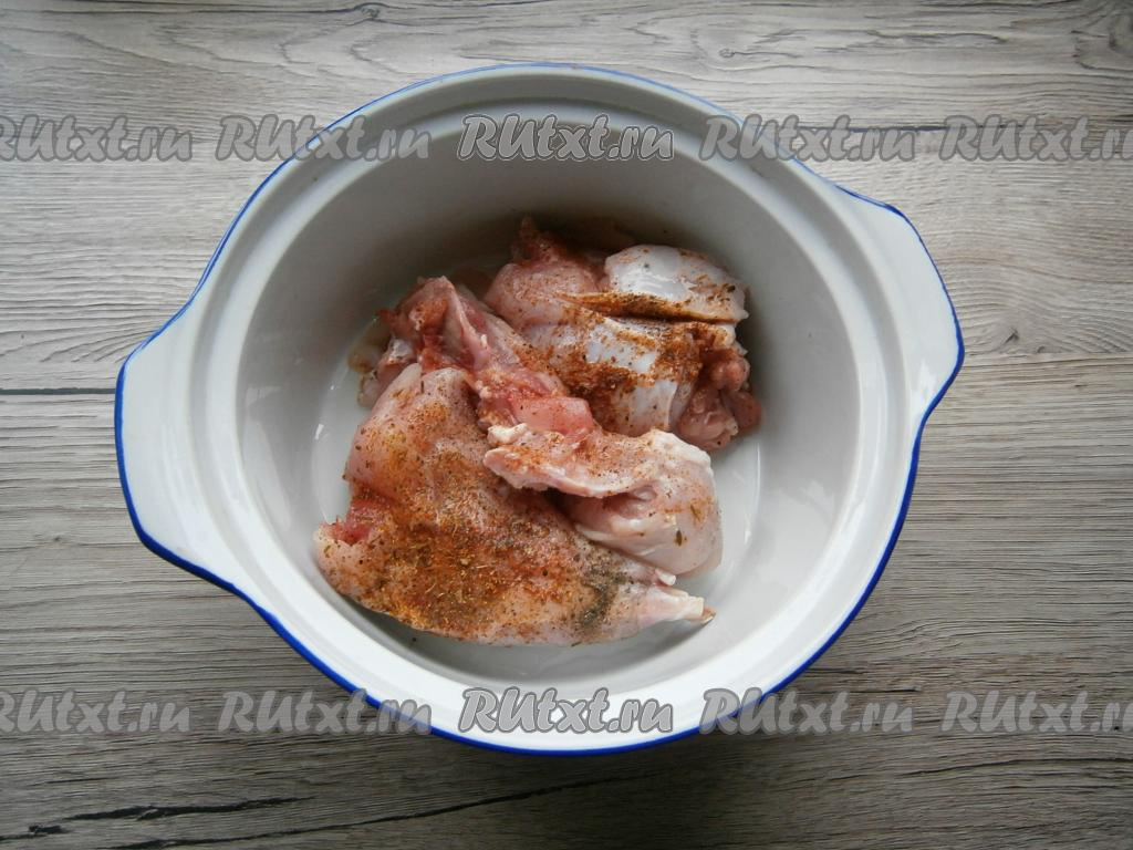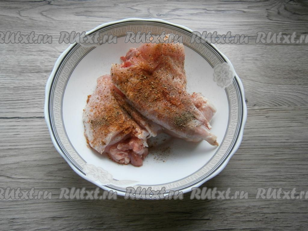 Посыпать кролика солью и специями (я посыпала чёрным молотым перцем и специями для мяса), тщательно перемешать, покрывая мясо специями со всех сторон. Оставить на 30 минут, чтобы кусочки кролика пропитались специями.
