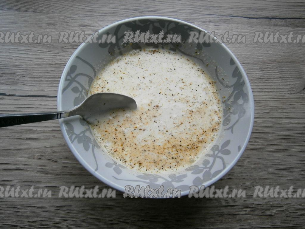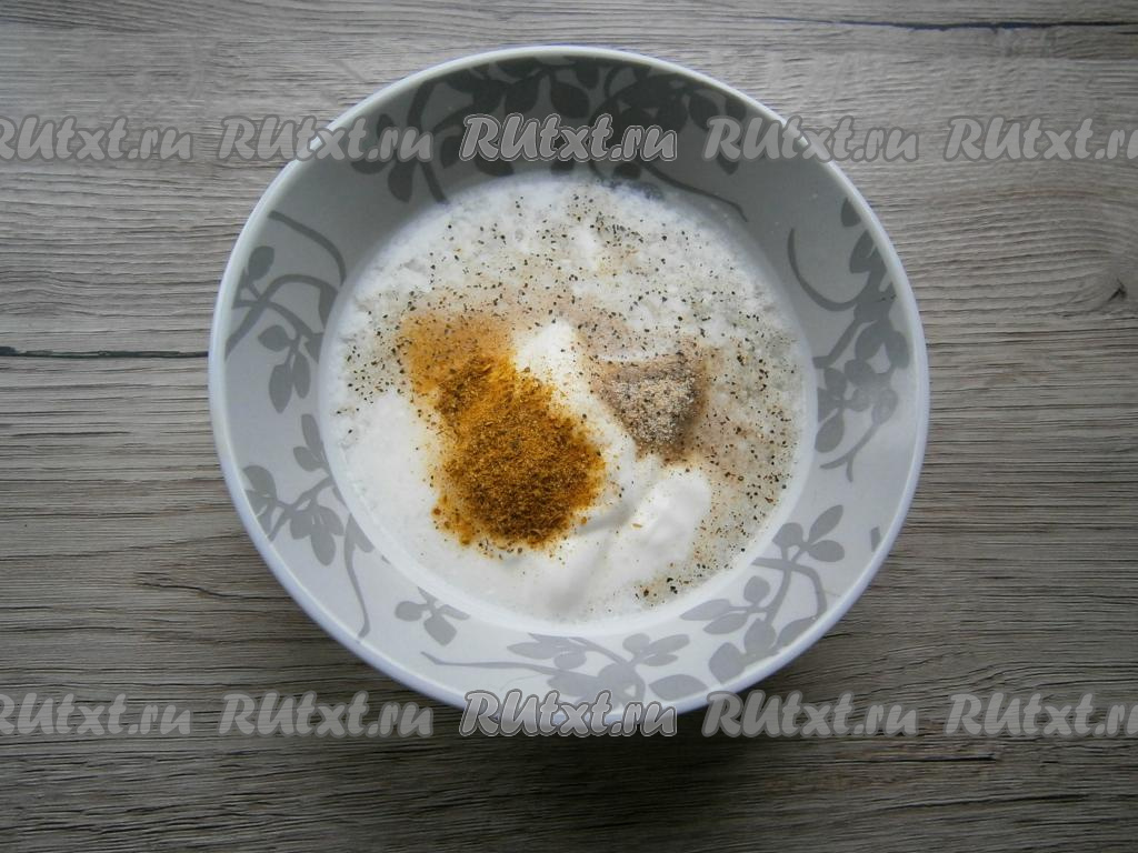 В достаточно глубокую тарелку выложить сметану любой жирности, добавить соль, специи по вкусу (я всыпала 1 чайную ложку порошка карри и 1 чайную ложку чесночного перца), влить 100 миллилитров воды.