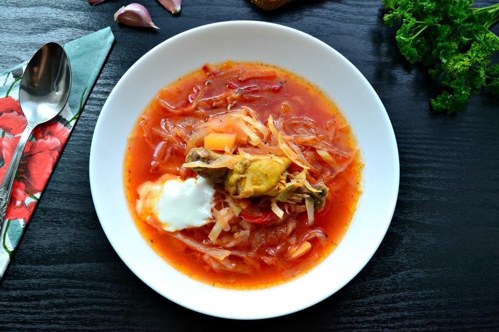 Необычайно наваристый и очень вкусный борщ с курицей, приготовленный в мультиварке, оставить под закрытой крышкой на 15 минут, после чего разлить по тарелкам и подать к столу со сметаной.