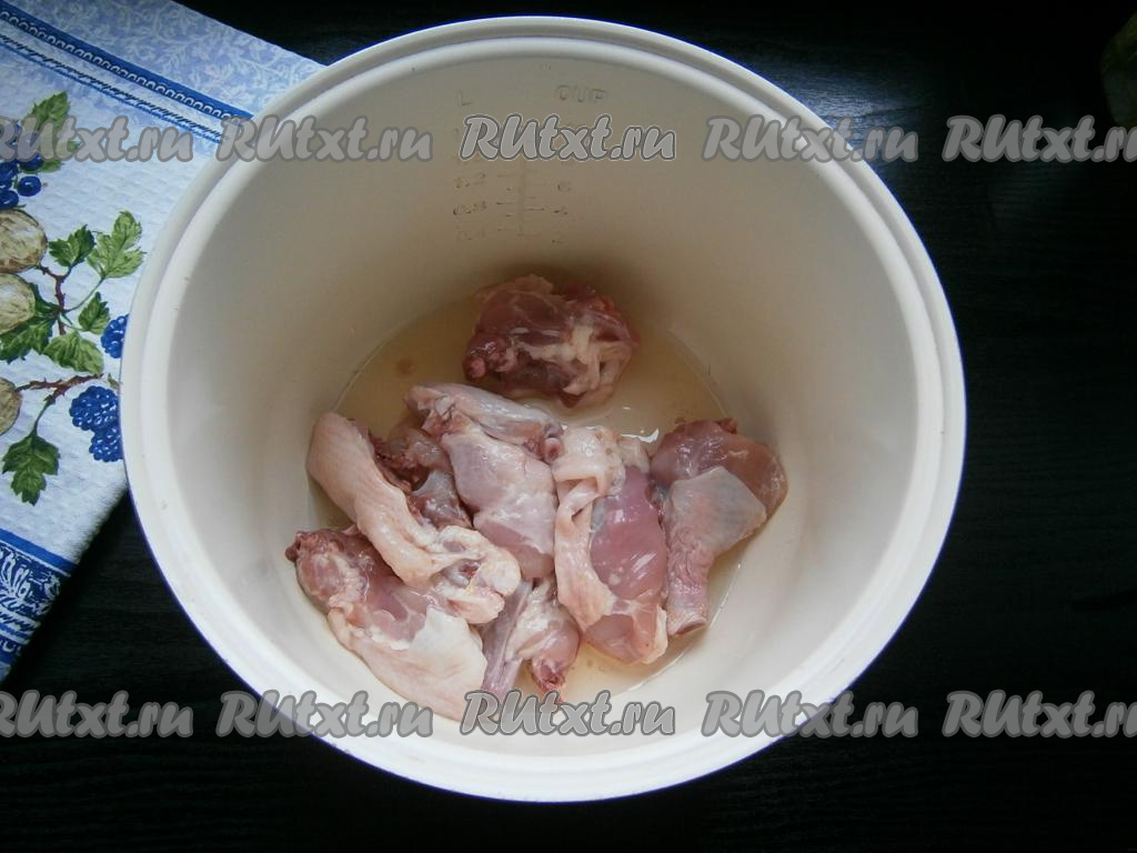 Курицу порубить на части, выложить в чашу мультиварки, добавить растительное масло.