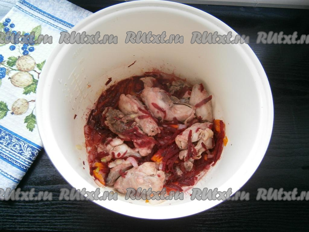 Чашу с курицей поместить в мультиварку, выставить программу "Жарка" на 20 минут. Обжаривать курицу 10 минут, перемешивая, после чего добавить лук, морковь и 2/3 свеклы (одну треть свеклы оставить), обжаривать оставшиеся 10 минут, иногда перемешивая.