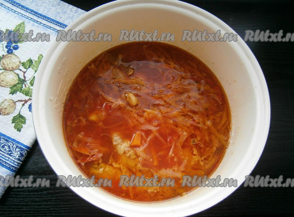 Всыпать в борщ сахар и добавить нарезанный очищенный чеснок. Закрыть крышку мультиварки и готовить борщ с курицей до окончания программы.