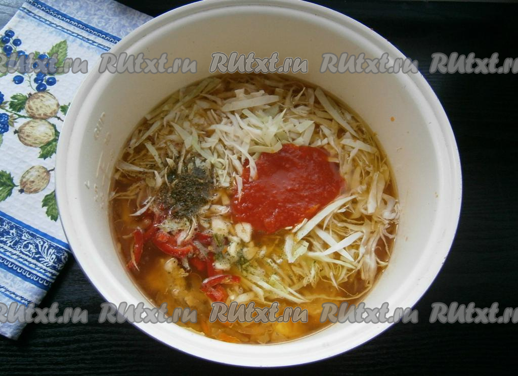 Через 40 минут добавить в чашу капусту с болгарским перцем, специи и томатный соус.