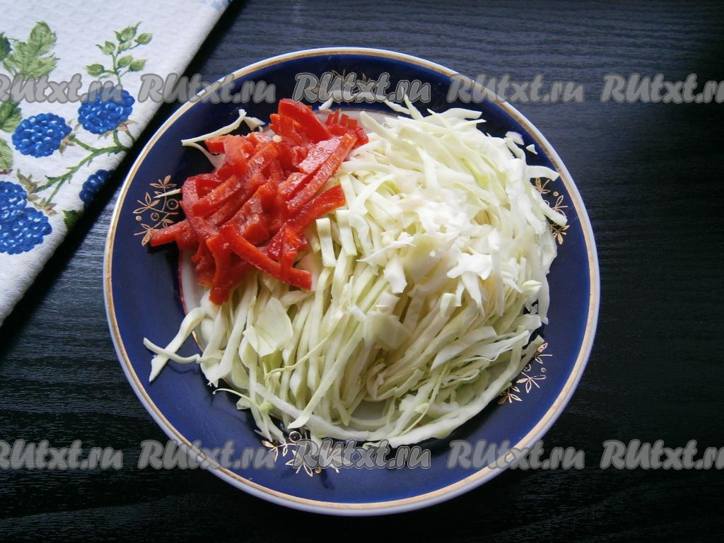 Тонко нашинковать капусту, перец болгарский нарезать соломкой.
