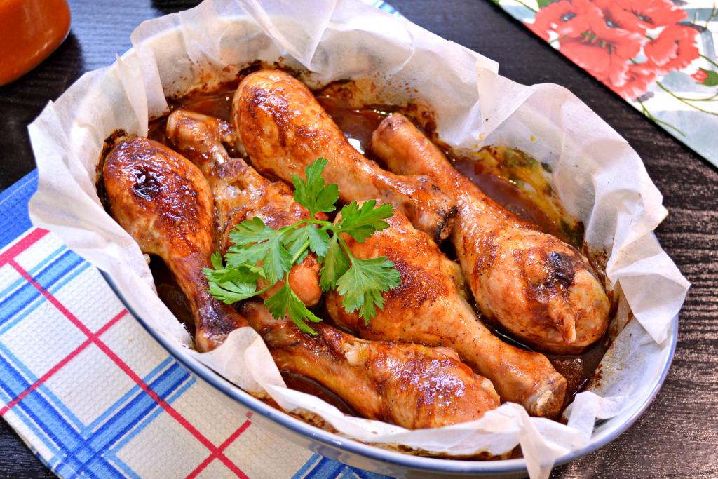 По прошествии 30 минут выложить промариновавшиеся куриные ножки в один слой в форму для запекания (я предварительно застелила форму пергаментом, но это по желанию). Поверх ножек влить в форму медово-соевый соус, в котором мариновалось мясо. Запекать ножки в разогретой до 180 градусов духовке в течение 50 минут (до готовности мяса). Для того чтобы убедиться в готовности, сделайте на ножке разрез ножом, если выделяется прозрачный сок без примесей крови, значит мясо готово.