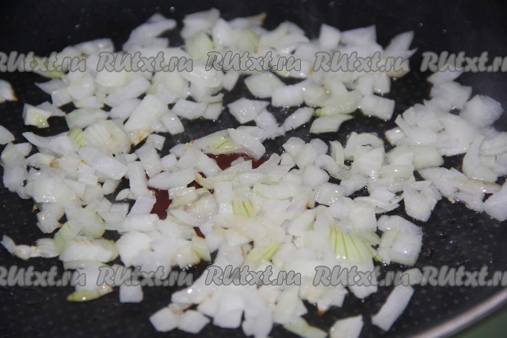 На сковороде, разогретой с добавлением растительного масла, обжарить нарезанный лук до золотистого цвета, иногда помешивая.