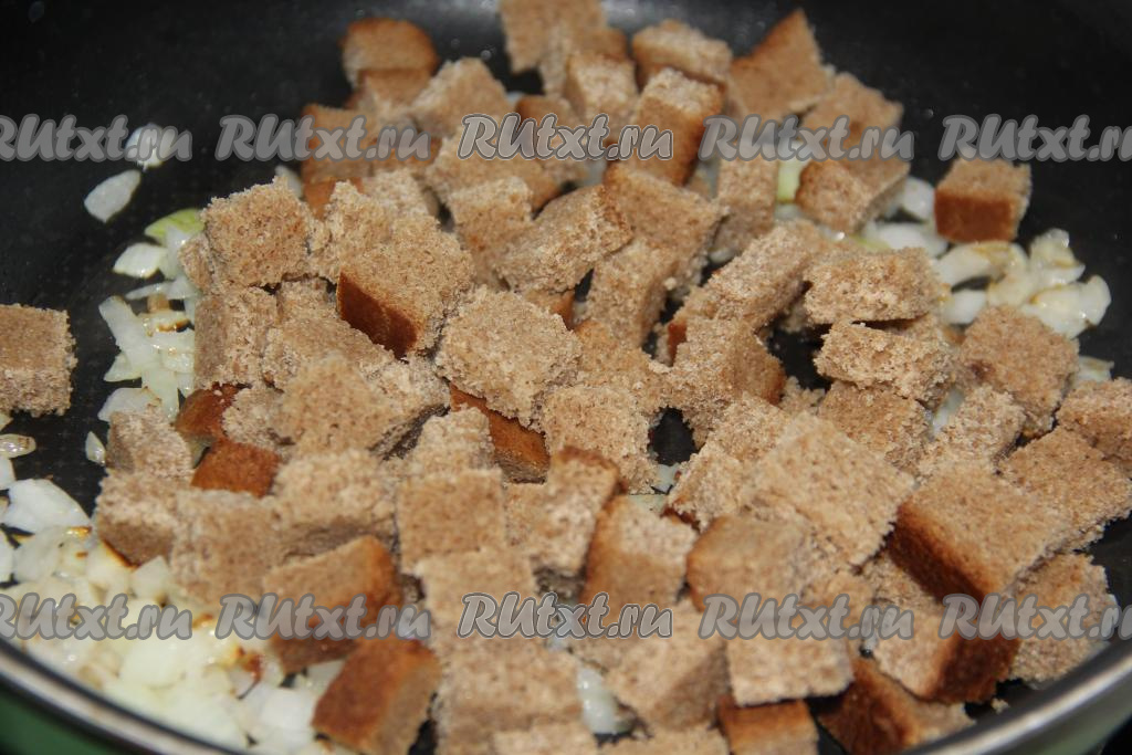 Хлеб нарезать на мелкие кубики и добавить в сковороду к луку. Обжарить в течение 5-7 минут, периодически помешивая.