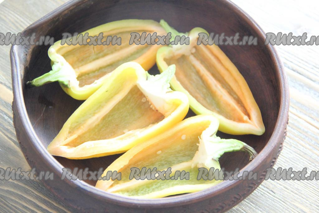 Перец вымыть, разрезать пополам, оставить хвостик, а семена удалить. Выложить лодочки из перца в жаропрочную форму.