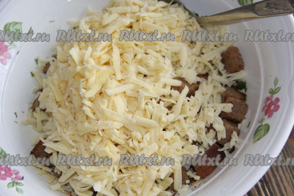 Твердый сыр натереть на средней тёрке, чеснок очистить и пропустить через пресс. Переложить хлеб, обжаренный с луком, со сковороды на тарелку, добавить натёртый сыр, чеснок, мелко нарезанную зелень, посолить и поперчить, затем тщательно перемешать получившуюся вегетарианскую начинку для фарширования перцев.