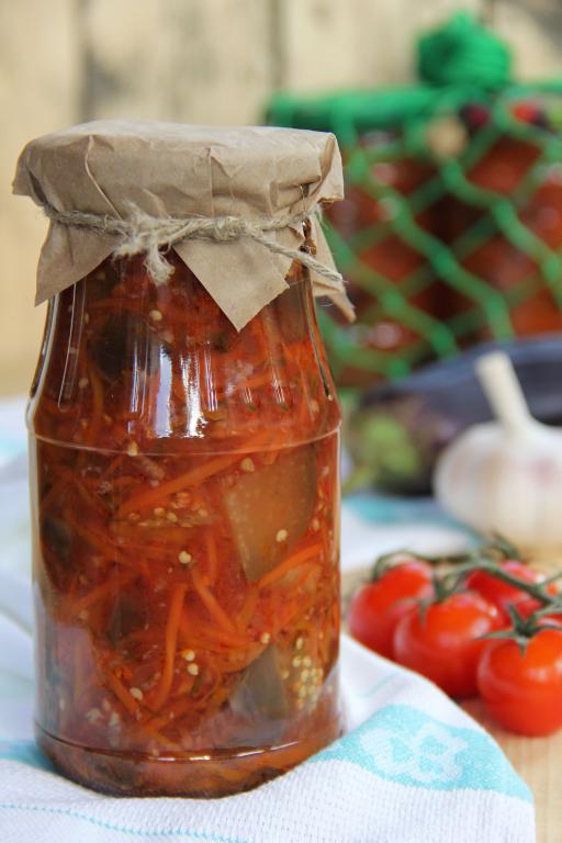В сезон заготовок я готовлю всевозможные салаты и закуски на зиму. Очень люблю салатики с баклажанами и морковью, кабачками и помидорами. Хочу поделиться простым рецептом приготовления очень вкусного, пикантного, в меру острого салата с баклажанами и помидорами на зиму. В баночках этот салатик выглядит очень аппетитно и ярко!