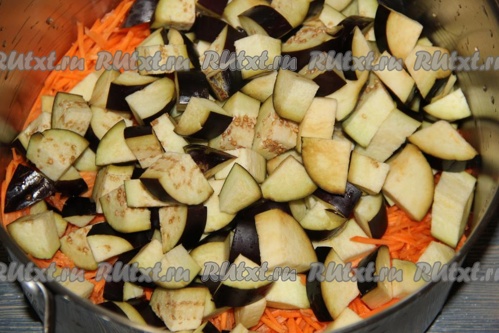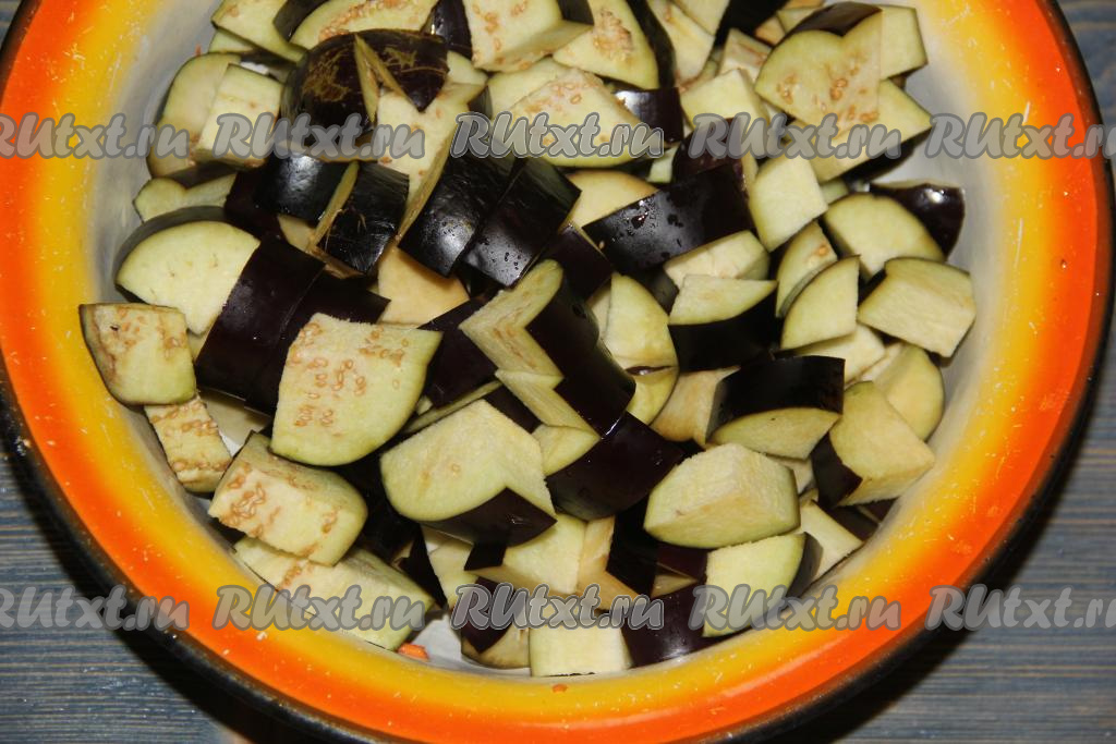 Баклажаны вымыть и нарезать на кусочки среднего размера. Мельчить не стоит, баклажанчики должны выделяться в салате.