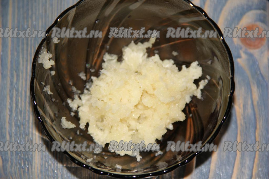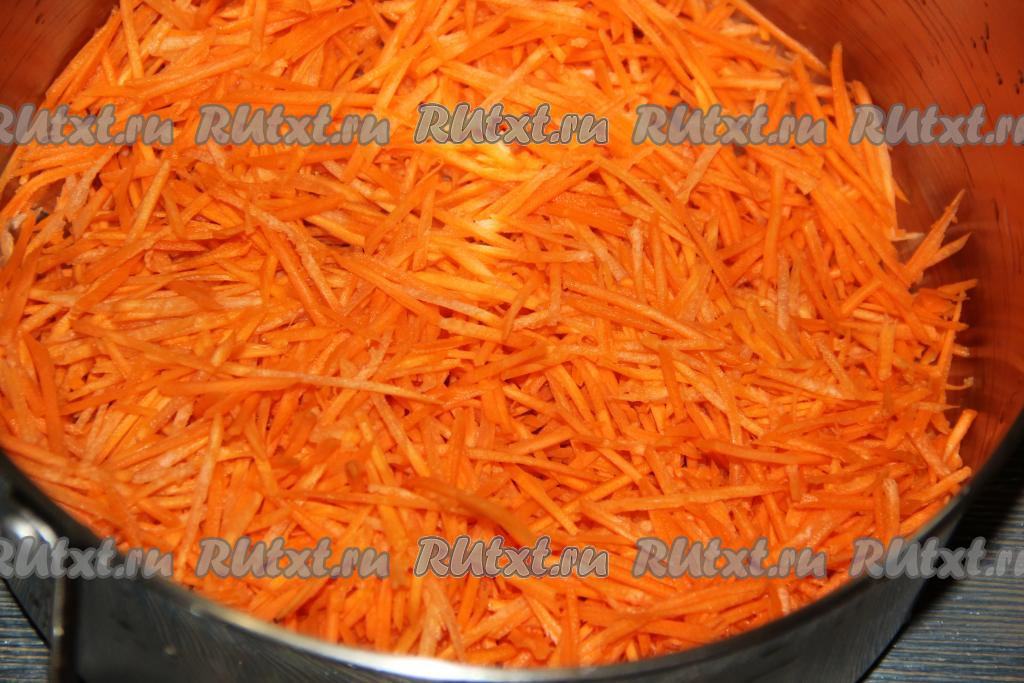 Очищенную морковь натереть на тёрке для моркови по-корейски, выложить в большую кастрюлю (я использую кастрюлю объёмом 7 литров).