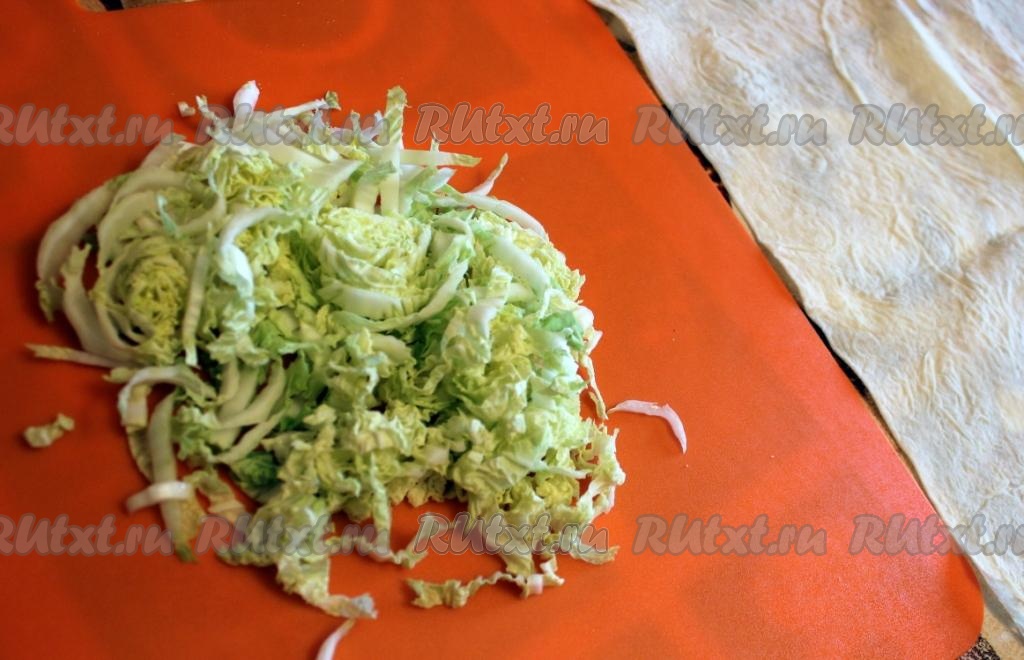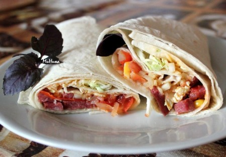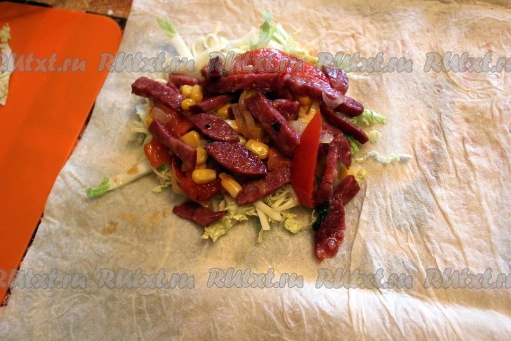 Затем добавить начинку из колбасы с овощами и свернуть шаурму.