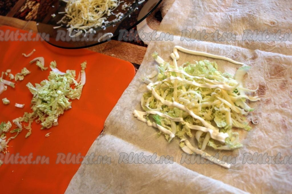 На небольшой участок, примерно 1/6 часть развёрнутого лаваша, положить салат, тёртый сыр, добавить майонез.