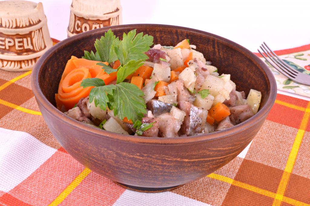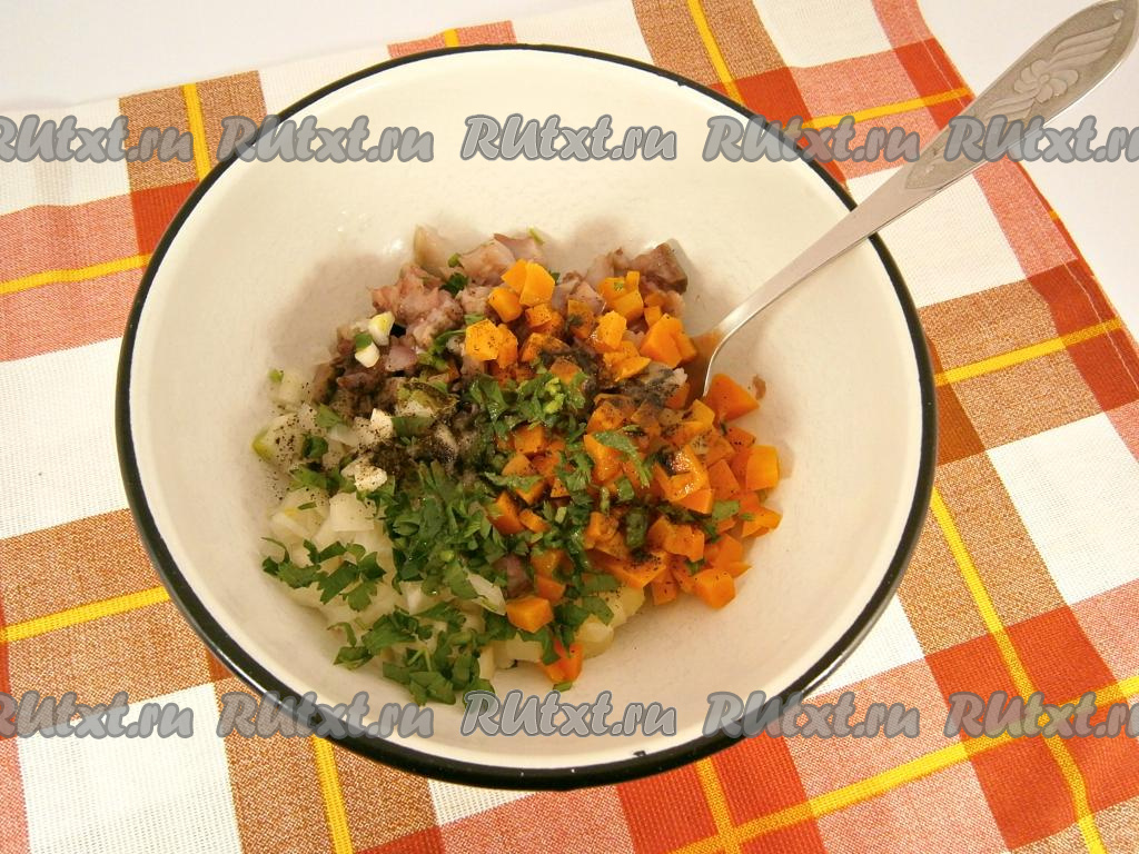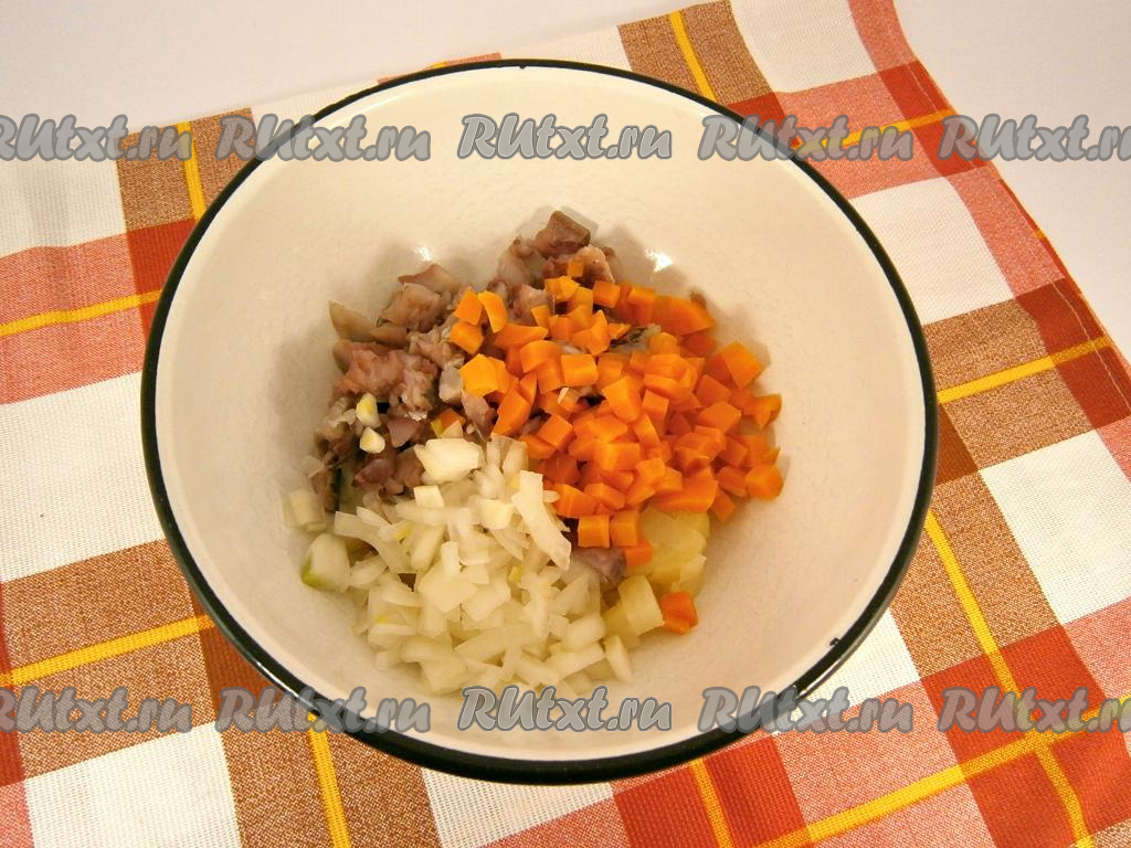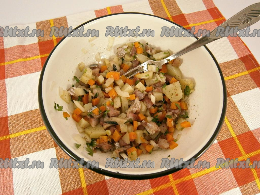 Затем воду с лука слить. Лук и нарезанную кубиками вареную морковь добавить к селедке и картофелю.
