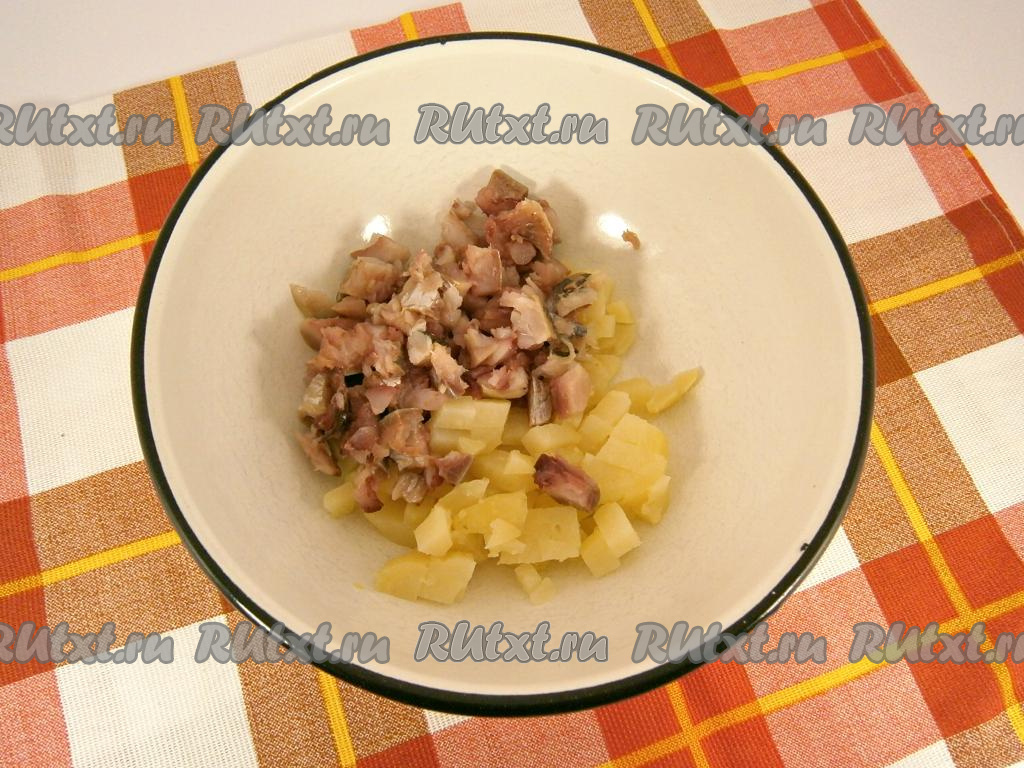 Филе сельди нарезать небольшими кусочками в миску, добавить нарезанный кубиками картофель.