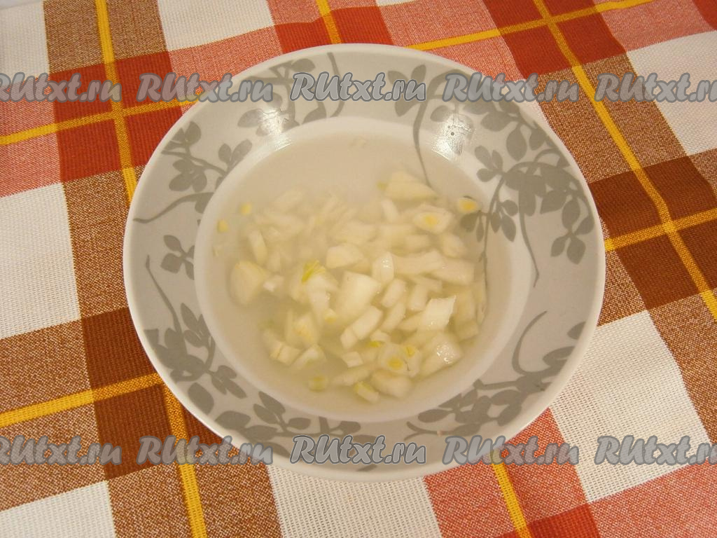 Лук репчатый нарезать маленькими кусочками и залить его кипятком на 10 минут.