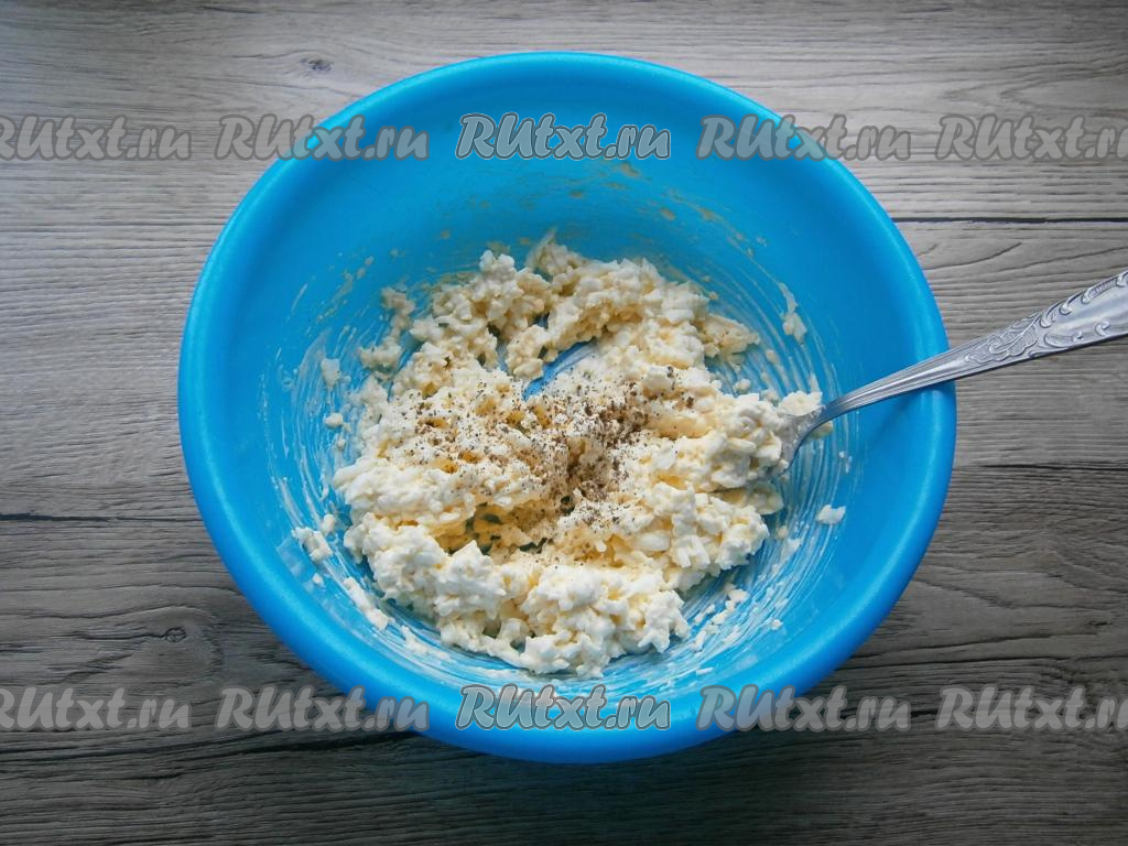Получившуюся массу посолить по вкусу, поперчить, тщательно перемешать.
