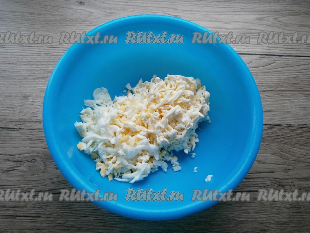 Яйца заранее отварить в течение 10 минут после закипания воды, а затем остудить и очистить. Сыр и яйца натереть на крупной тёрке в миску.