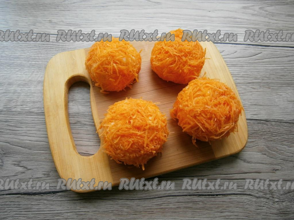Руками, смоченными водой, из сырной массы скатать небольшие шарики (размером с мандарины), обвалять шарики со всех сторон в натёртой морковке.
