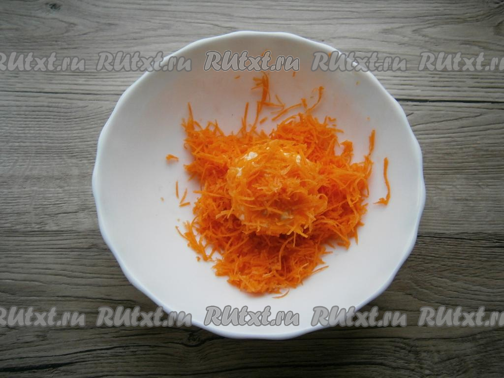 Сырую морковь очистить, натереть на мелкой тёрке в отдельную миску.
