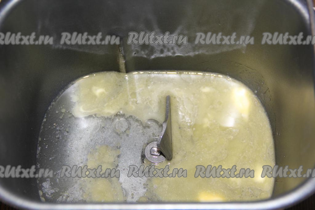 Влить в ведёрко хлебопечки тёплую воду, добавить растопленное не горячее сливочное масло, сахар и соль.
