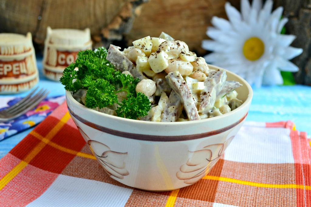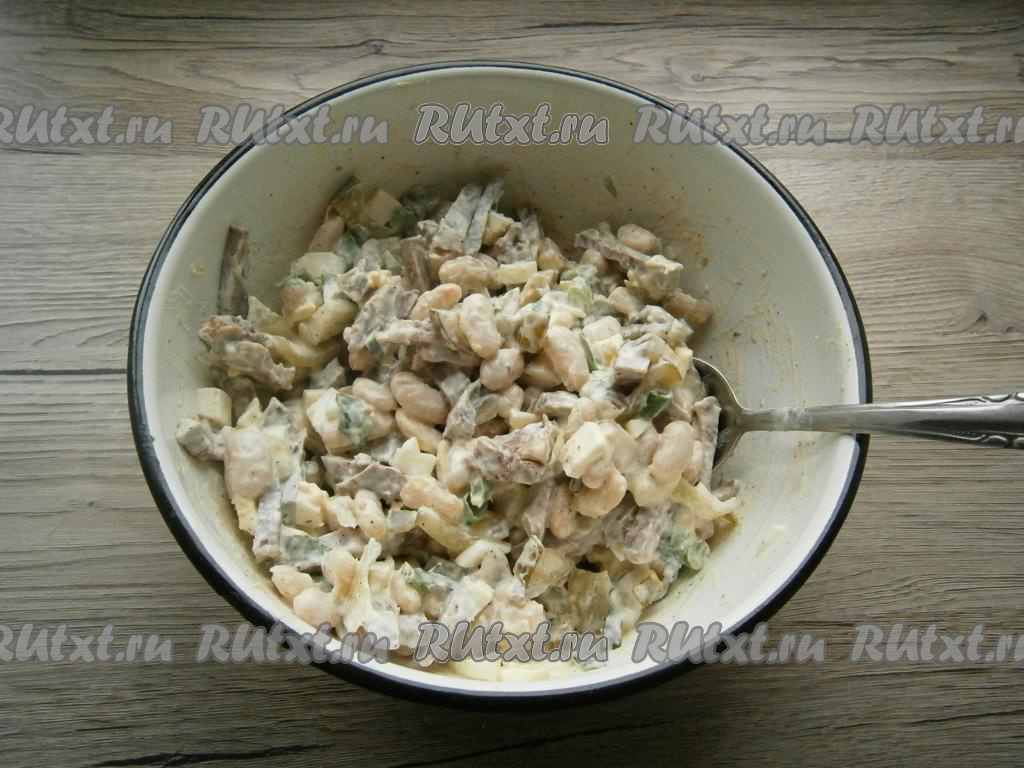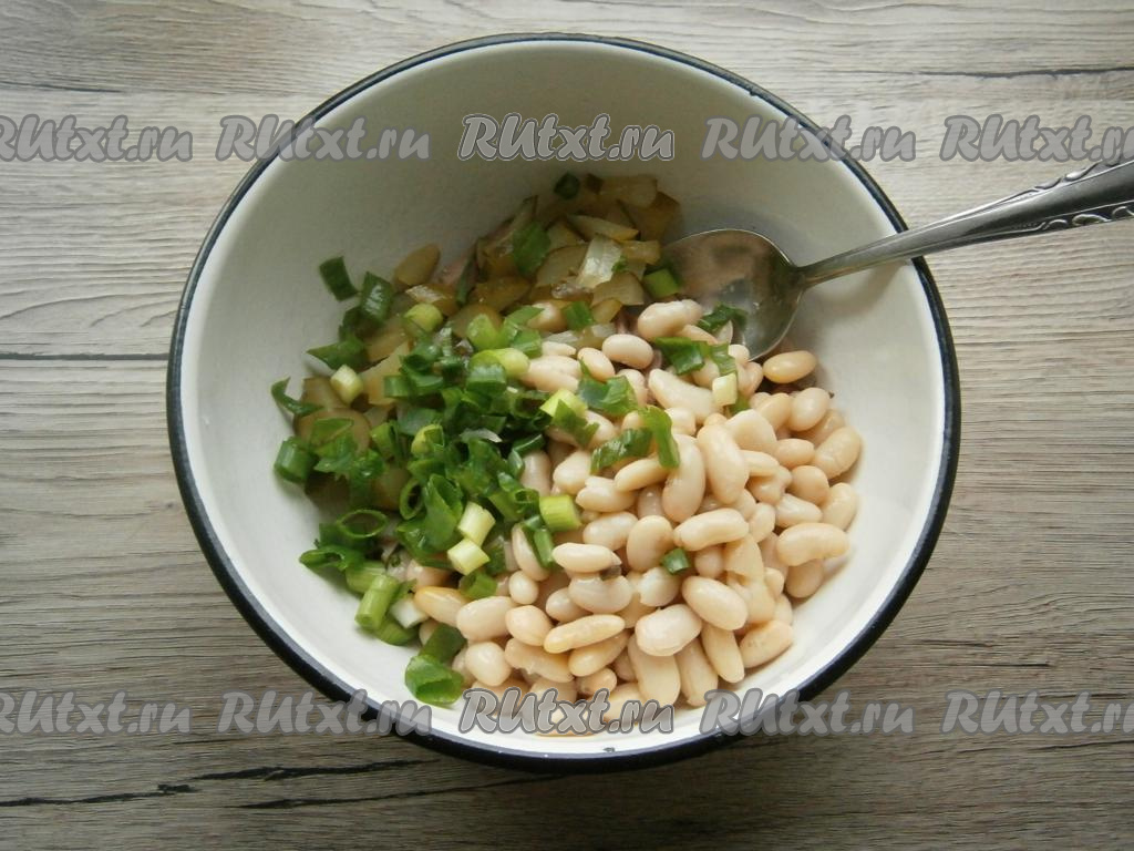 Из банки с фасолью слить жидкость. Фасоль и измельченный зеленый лук добавить в салат из языка и маринованных огурцов.