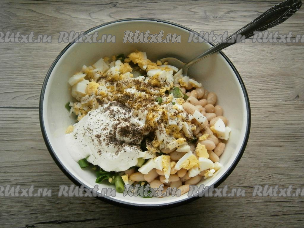 Сюда же добавить нарезанные вареные яйца. Салат посолить и щедро поперчить, добавить сметану.