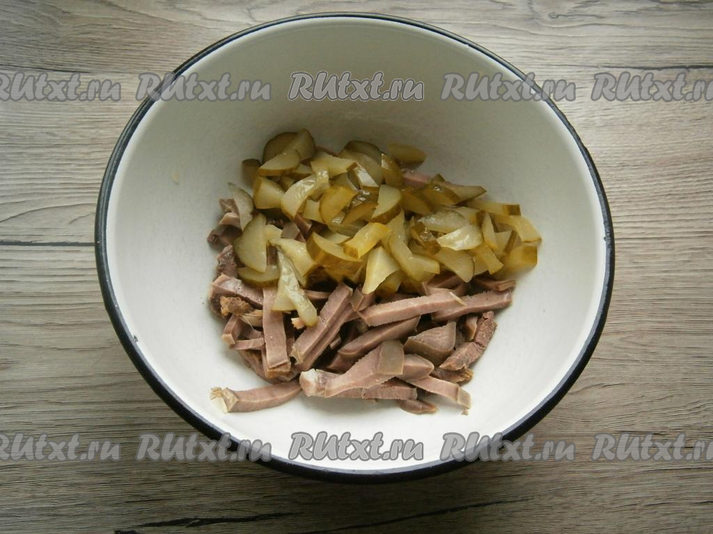 Полностью язык остудить, а затем нарезать брусочками. Добавить нарезанные кусочками маринованные огурцы.