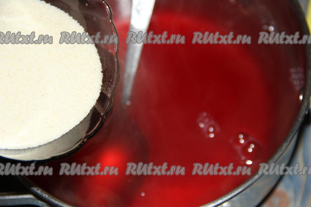 Добавить в кастрюльку с ягодным отваром сахар и ванильный сахар. Хорошо перемешать, затем тонкой струйкой всыпать манку, интенсивно перемешивая венчиком, затем поставить на огонь.
