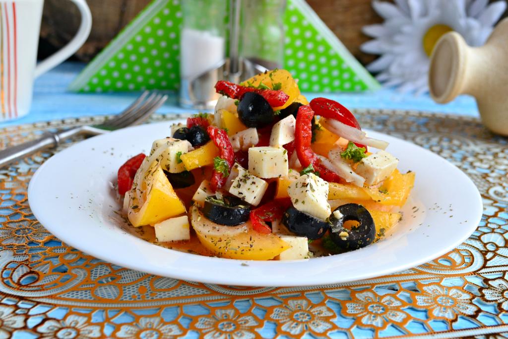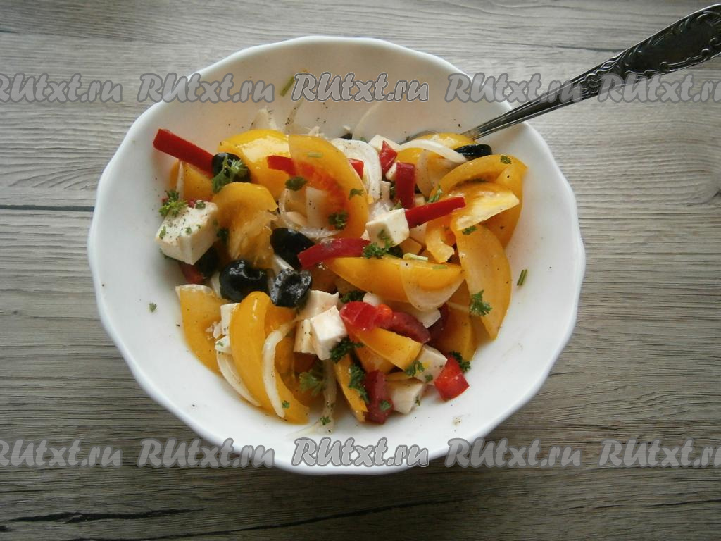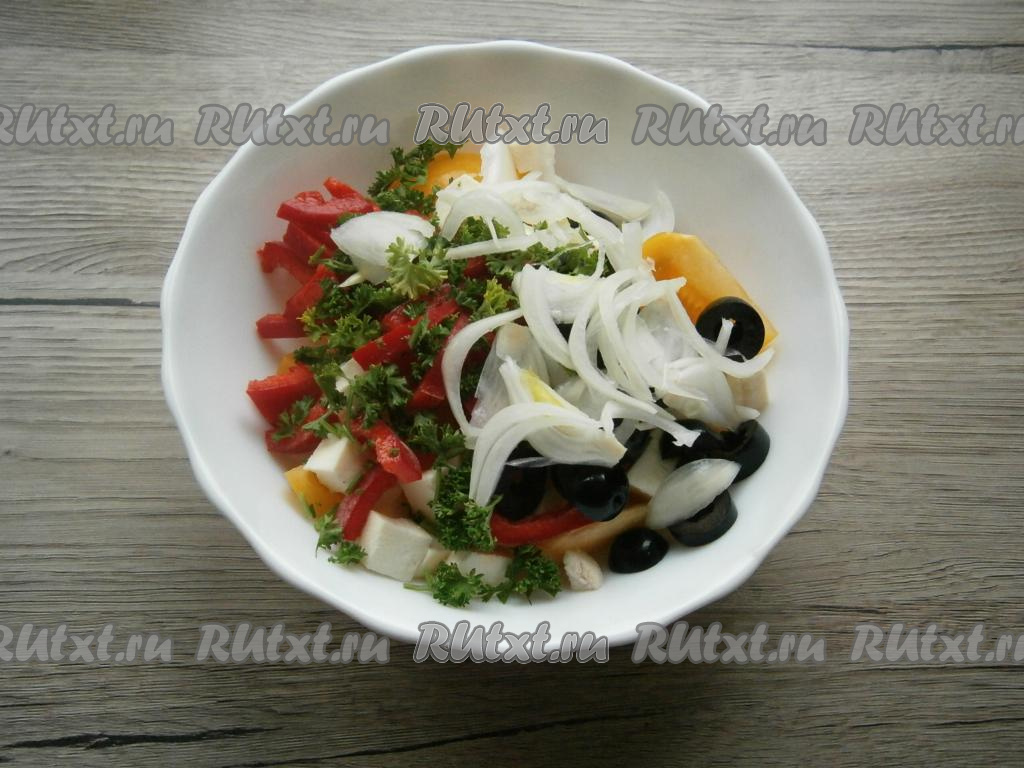 Сюда же добавить нарезанный соломкой болгарский перец, предварительно очищенный от семян, и нарезанные кружочками черные маслины.