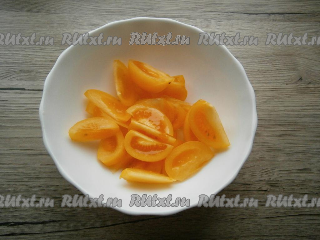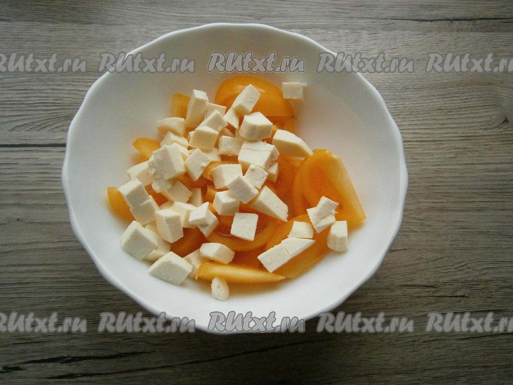 Добавить к помидорам нарезанную небольшими кубиками брынзу.